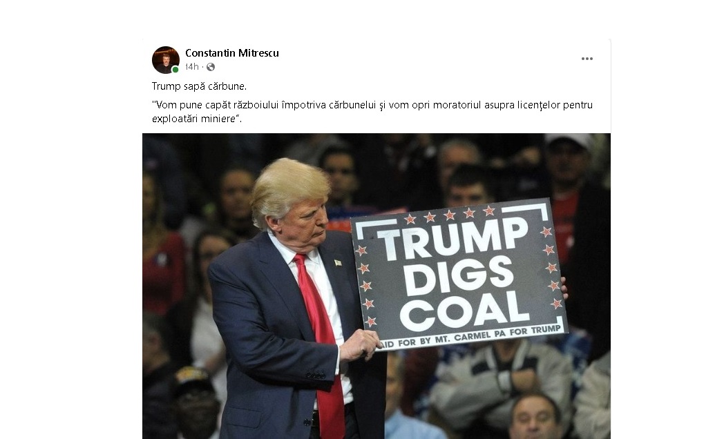 ”America s-a trezit, sper s-o facă și Uniunea Europeană” afirmă Constantin Mitrescu, președintele Sindicatului Energia Rovinari, în condițiile în care Trump s-a pronunțat pro combustibili fosili.