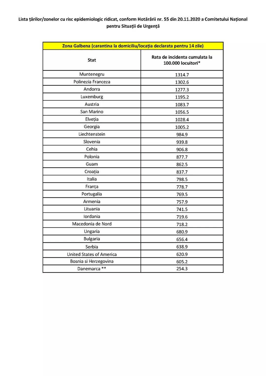 Lista țărilor/zonelor cu risc epidemiologic ridicat, conform Hotărârii nr. 55 din 20.11.2020 a Comitetului Național pentru Situații de Urgență.