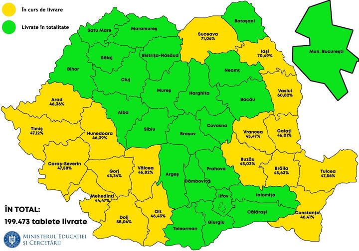 Potrivit ministrului Educației, procesul de livrare a tabletelor s-a încheiat în județele: Argeș, Mureș, Ilfov, Brașov, Prahova, Harghita, Sibiu, Teleorman, Dâmbovița, Alba, Covasna, Călărași, Ialomița și Giurgiu, Neamț, Bihor,…