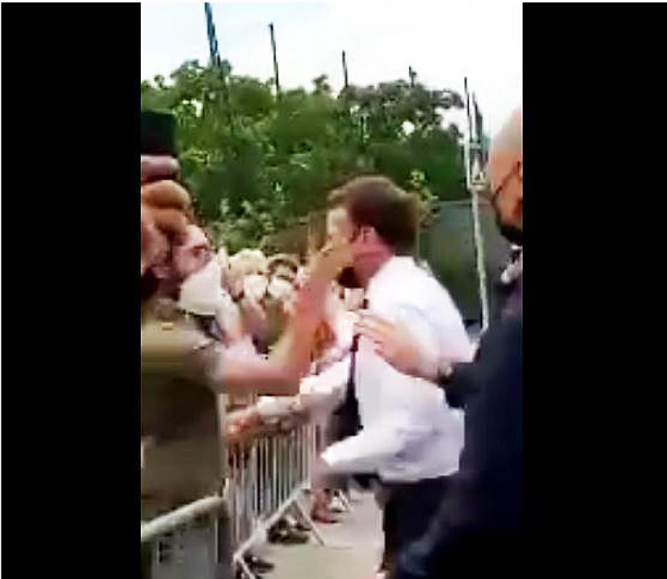 BFM TV și RMC au publicat o înregistrare video distribuită pe Twitter care arată un bărbat într-un tricou verde, cu ochelari de soare și cu o mască de protecție strigând „Jos cu Macronia!” („A Bas La Macronie”) înainte de a-l lovi…