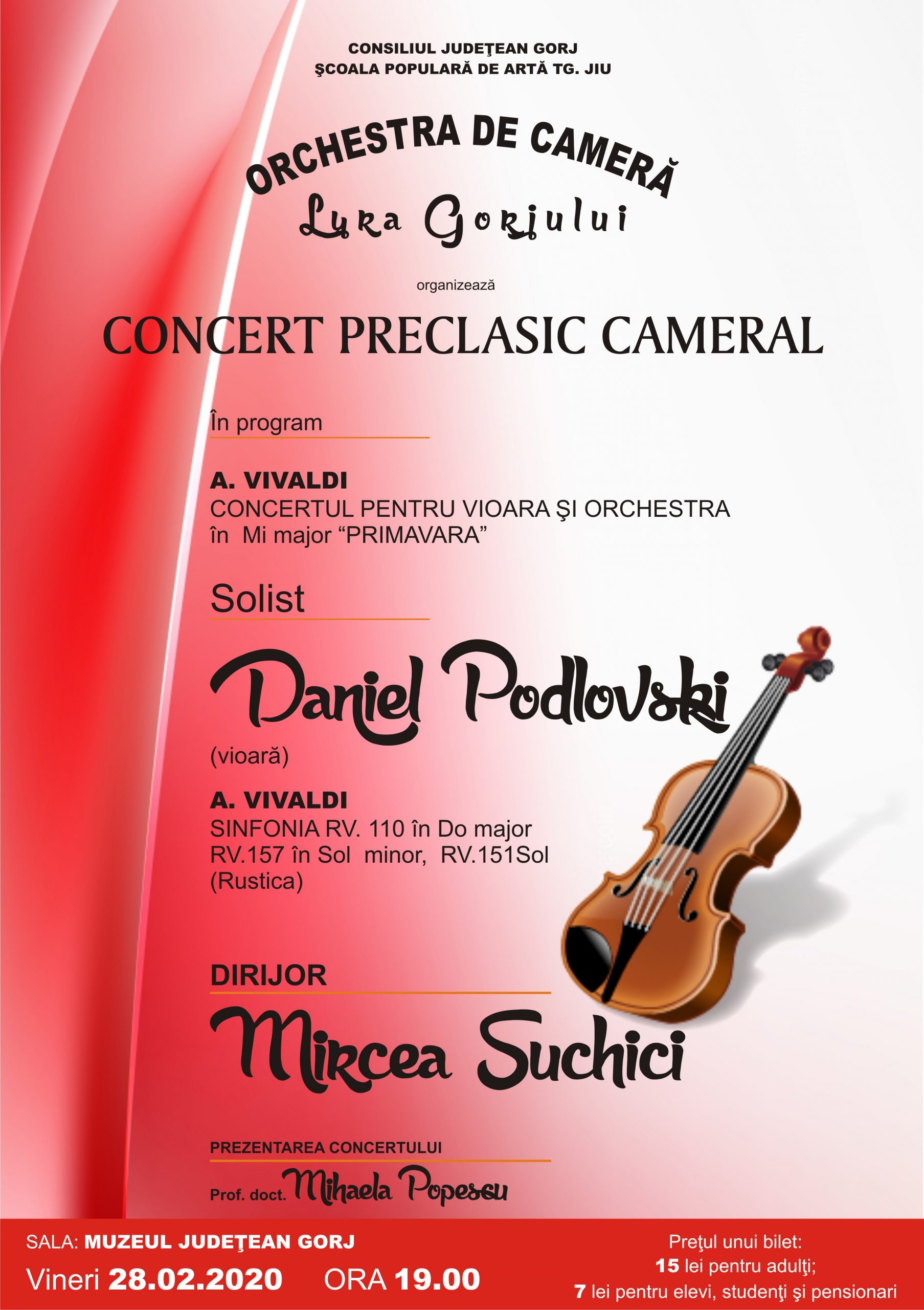 Vineri, 28 februarie 2020, la ora 19:00, dirijorul și violocelistul Mircea Suchici revine la pupitrul Orchestrei de Cameră ”Lyra Gorjului” și propune melomanilor târgujieni un program integral ANTONIO Vivaldi. Concertul este un prilej de a-l aplauda pe cunoscutul violonist Daniel Podlovschi, care va interpreta celebrul Concert pentru vioară și orchestra în Mi major ”Primăvara”. Seara, de la Muzeul Județean Gorj ”Alexandru Ștefulescu”, se va încheia cu Sinfonia RV. 110…