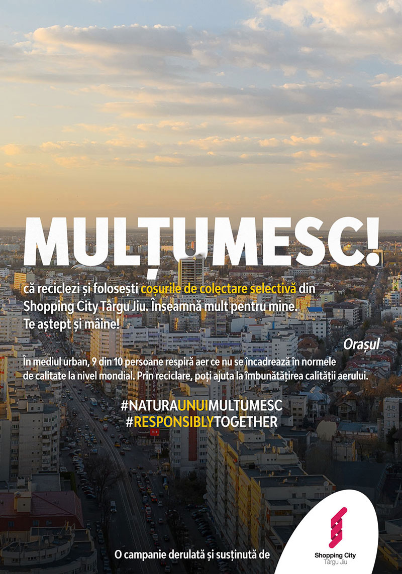Shopping City Târgu Jiu implementează începând din această lună prima inițiativă de colectare selectivă și administrare a deșeurilor la sursă a centrului comercial. Desfășurată sub conceptul „Natura unui MULȚUMESC”, campania dă voce beneficiarilor direcți: Apa, Pădurea, Orașul și pune publicul față în față cu schimbările pe care colectarea selectivă le poate aduce concret în fiecare dintre cele trei medii.