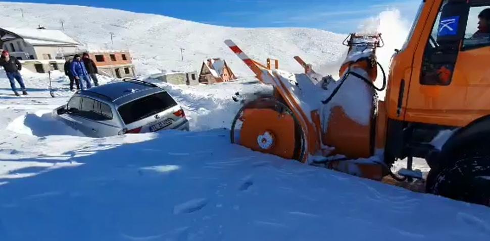 Autoturismul era parcat în afara drumului național și a fost scos din zăpadă cu ajutorul angajaților secției Târgu Jiu de la Drumurile Naționale.