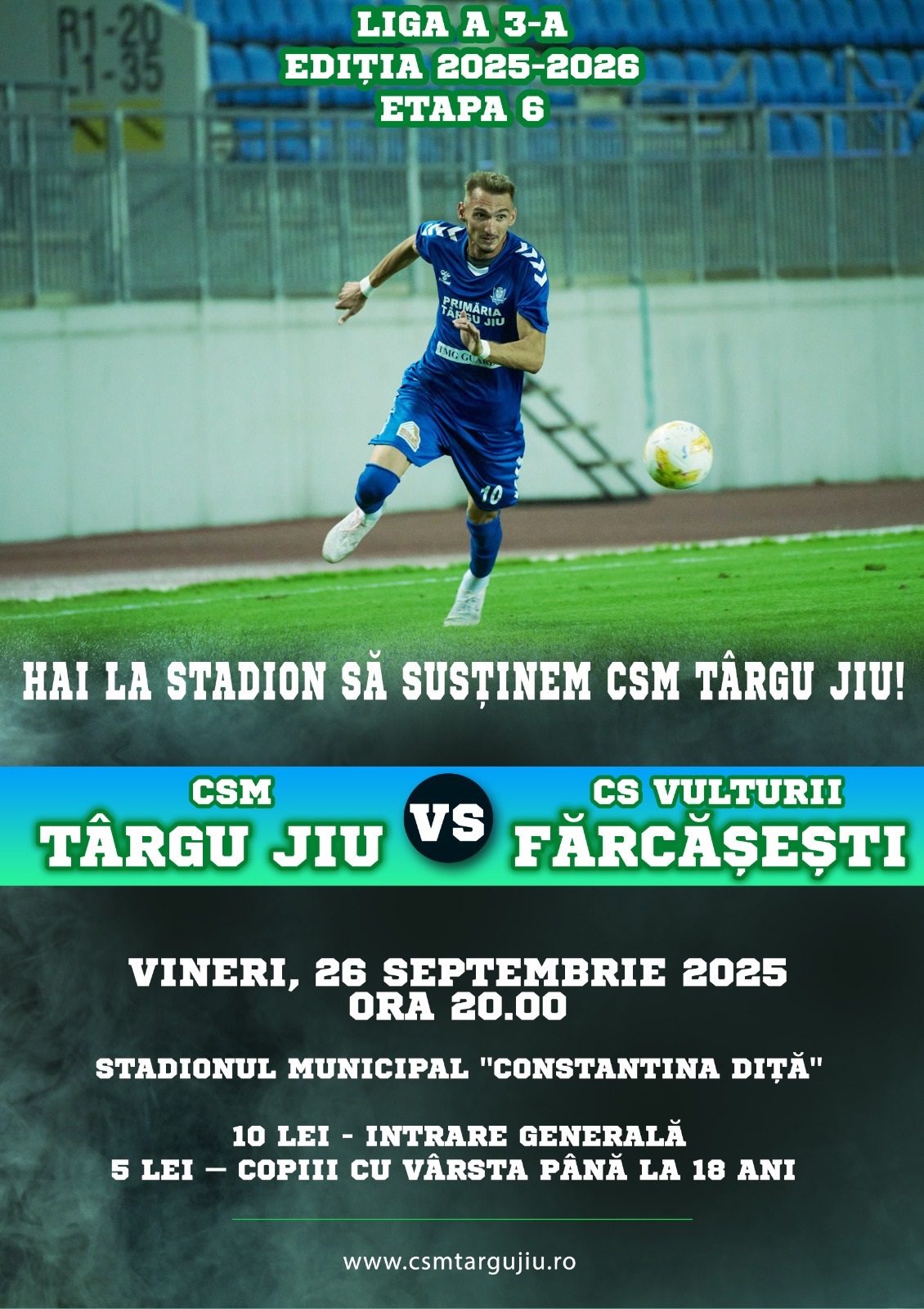 CSM Târgu Jiu revine, vineri, pe Municipal pentru o nouă partidă din Liga a 3-a, cu Vulturii Fărcășești. Meciul contează pentru etapa a 6-a din Seria a 6-a și va începe la ora 20:00.