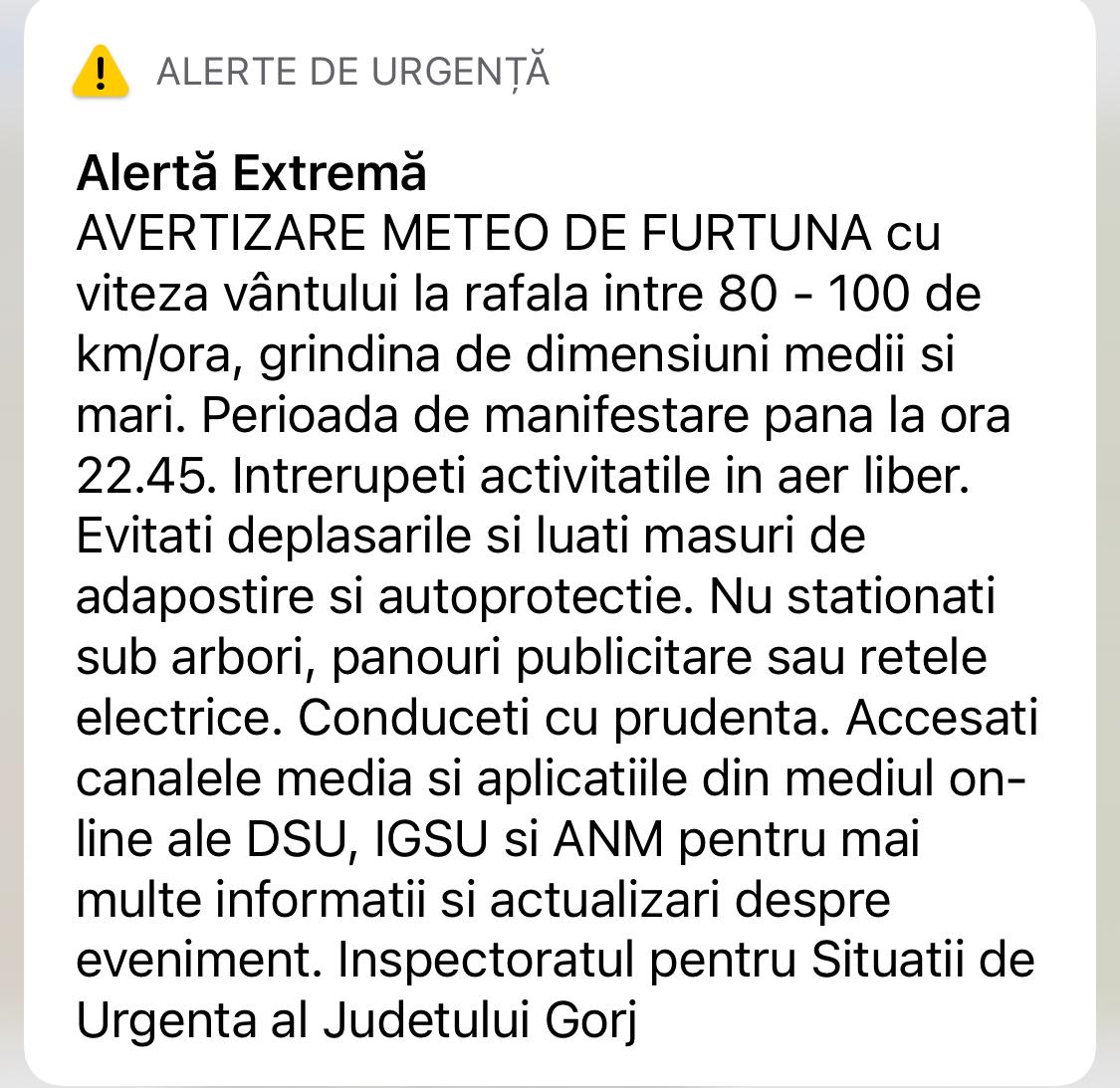 Pentru avertizarea populatiei din zonele vizate de fenomenele meteorologice extreme, ISU Gorj a transmis un mesaj prin intermediul RO-Alert.