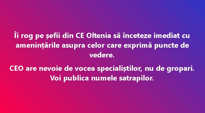 Liderul USR Gorj îi numește ”satrapi” pe șefii din CEO care le pun pumnul în gură specialiștilor. Parlamentarul a cerut, public, în urmă cu două săptămânii ca oamenii competenți din companie să facă pasul în față. Aceștia i-au semnalat, însă, că, atunci când vin cu soluții, sunt amenințați.