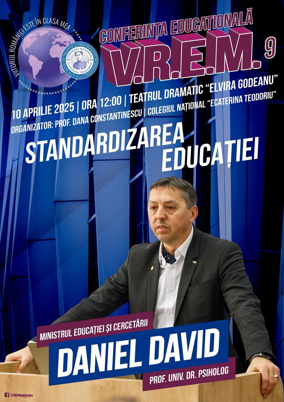 Teatrul Dramatic „Elvira Godeanu” din Târgu Jiu va găzdui pe 10 aprilie, la ora 12:00, Conferința Educațională VREM 9, un eveniment dedicat standardizării educației. Organizată de profesoara Dana Constantinescu, de la Colegiul Național „Ecaterina Teodoroiu”, conferința va adresa teme esențiale pentru viitorul învățământului din România. Ministrul Educației și Cercetării, prof. univ. dr. psiholog Daniel David, va fi prezent la eveniment și va susține un discurs…
