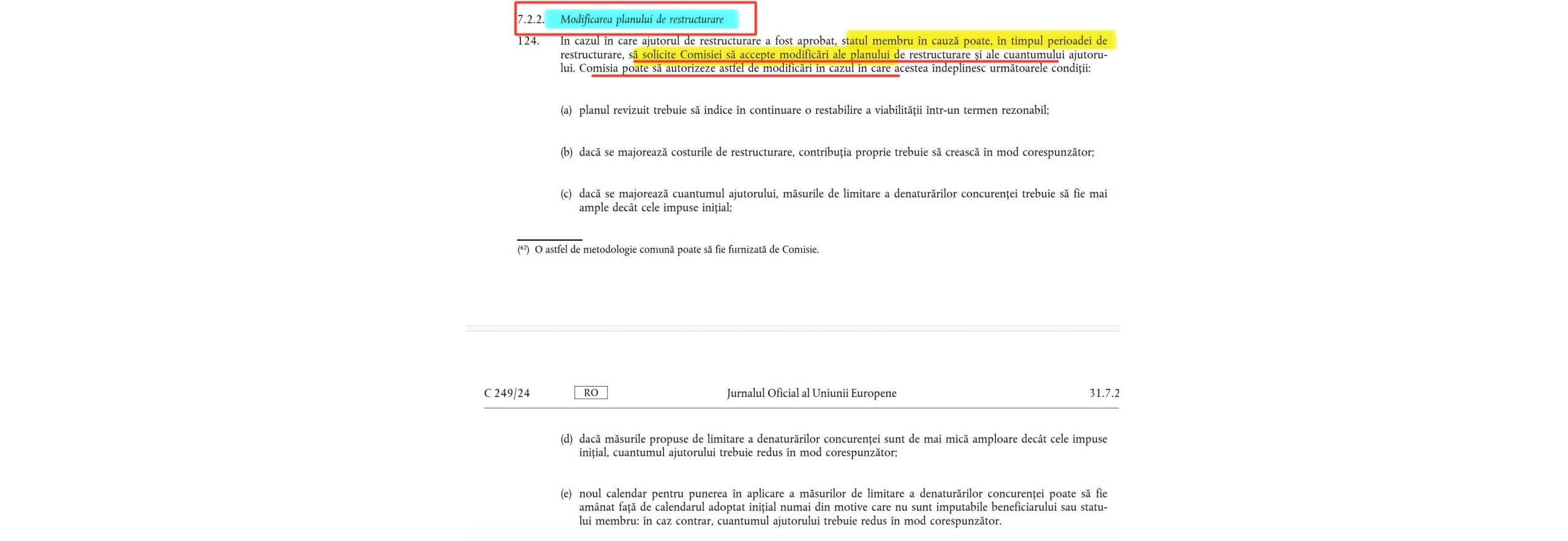 Conform documentului respectiv ”un stat membru poate, în timpul perioadei de restructurare, să solicite Comisiei să accepte modificări ale planului de restructurare și ale cuantumului ajutorului”, în anumite condiții. Miruță…