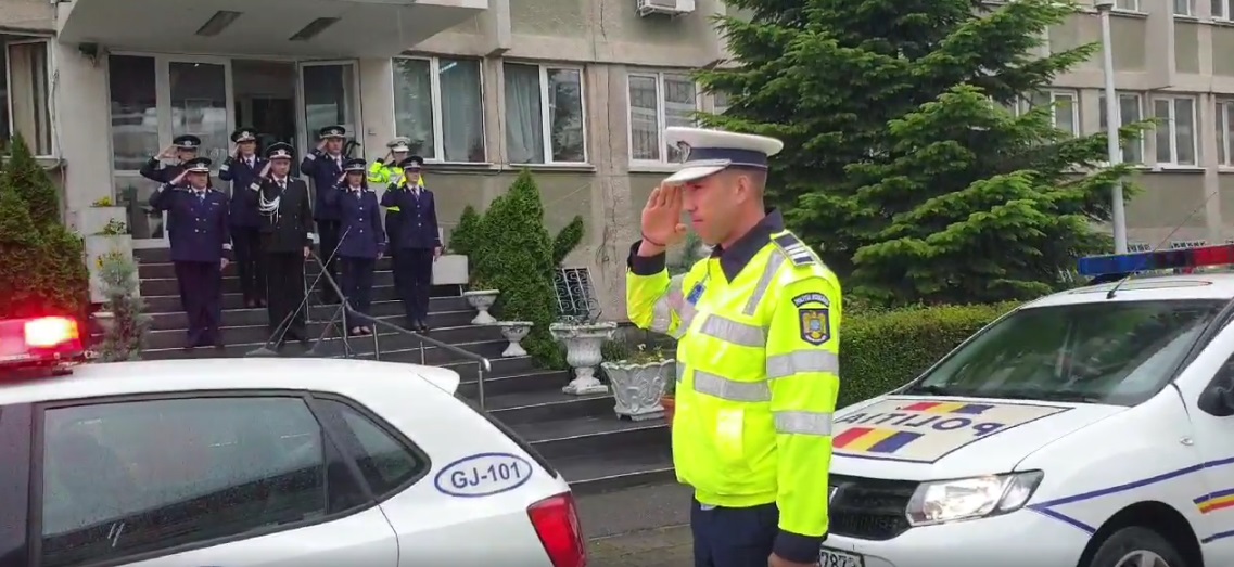 Un moment de reculegere a fost ținut, astăzi, la ora 12.00, în fața sediului IPJ Gorj, pentru polițistul împușcat mortal, ieri, de suspectul pe care îl urmărea, în localitatea timişeană Izvin. Autospecialele au staționat și au avut pornite semnalele acustice și luminoase, timp de un minut.