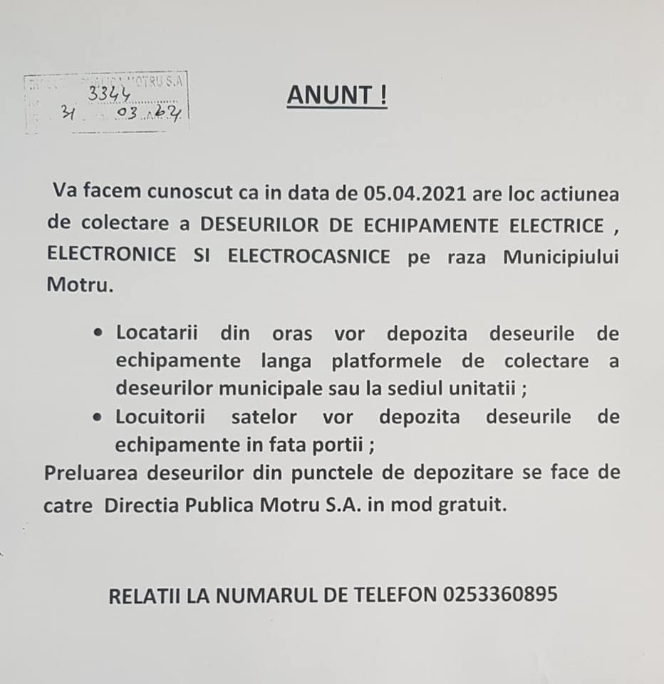 În data de 5 aprilie 2021, Direcția Publică Motru SA va desfășura acțiunea de colectare a deșeurilor de echipamente electrice, electronice și electrocasnice pe raza municipiului Motru.