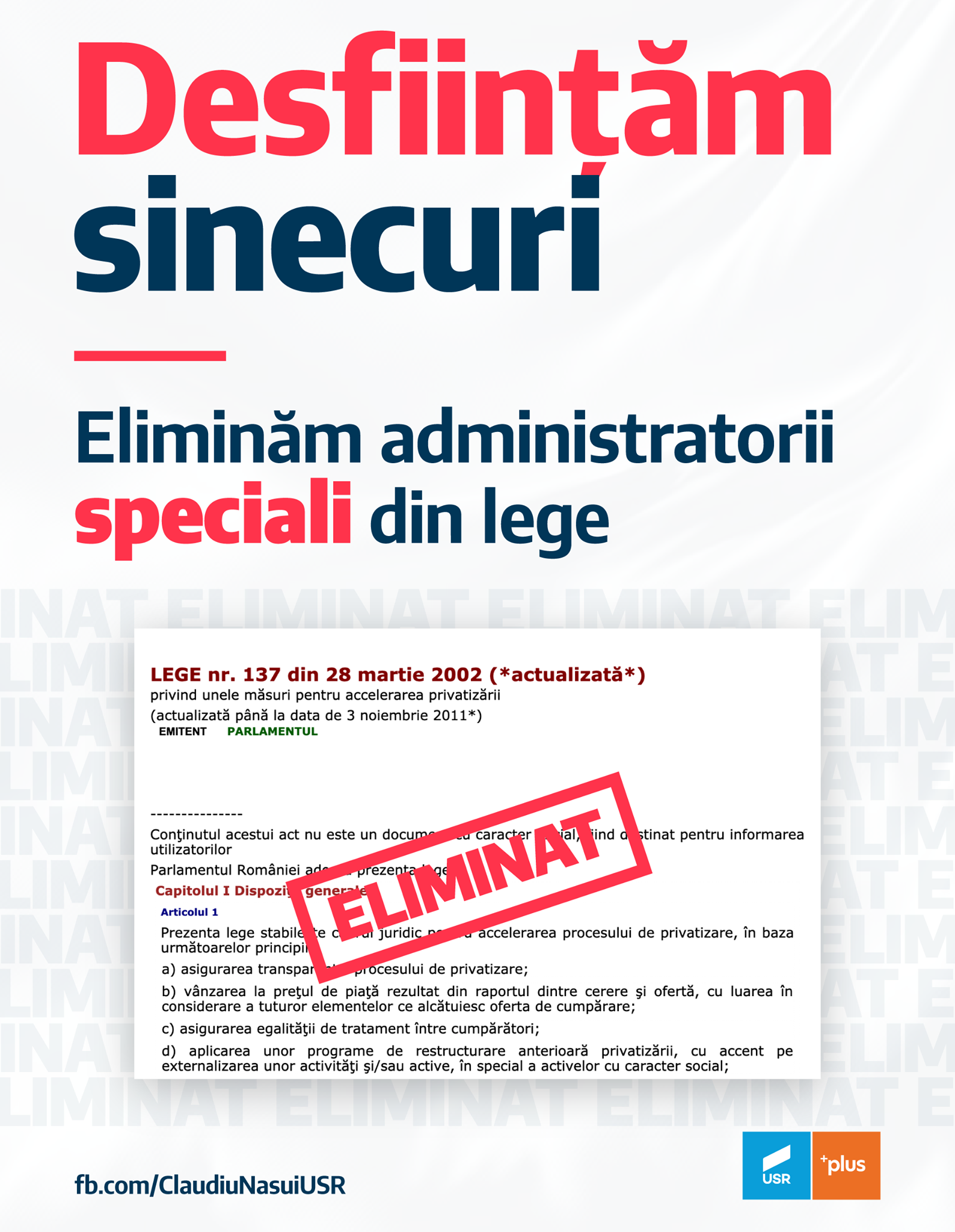Ministrul Economiei, Claudiu Năsui, a anunţat marţi că va pune pe circuitul de avizare o Ordonanţă de Urgenţă prin care elimină Legea 137/2002 privind numirea administratorilor speciali la companiile de stat aflate în insolvenţă, care ar fi trebuit să pregătească privatizarea acestor firme, dar în schimb ”le-au transformat în găuri negre prin care au sifonat bani două decenii întregi”.