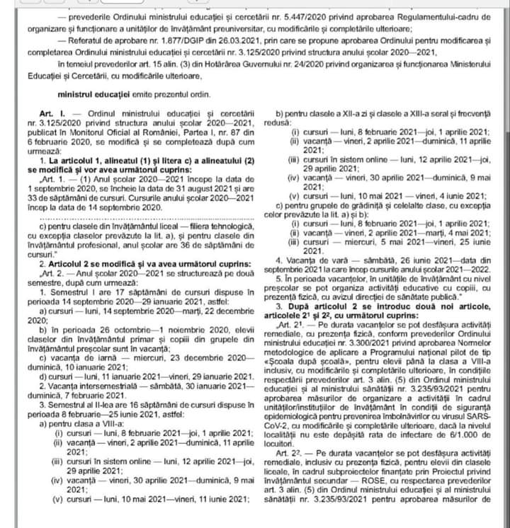 Ordinul de ministru privind modificarea structurii anului școlar 2020-2021 a fost publicat, în această dimineață, în Monitorul Oficial.