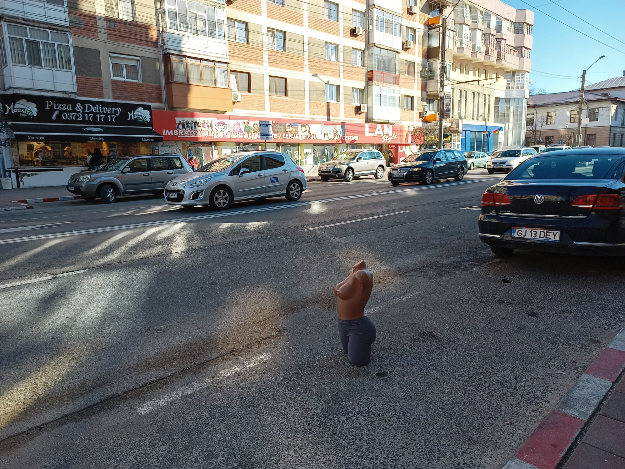 Un agent economic care deține un magazin de haine în centrul orașului Târgu Jiu a folosit un manechin pentru a rezerva locul de parcare din apropiere.