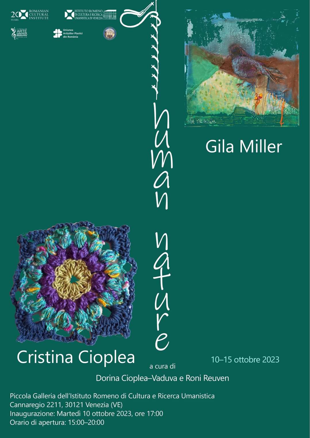 La Galeria Mică a Institutului Român de Cultură și Cercetare Umanistică din Veneția, va avea loc marți, 10 octombrie, de la ora 17.00, vernisajul expoziției de artă „Human Nature: Continuing the Conversation”, realizată de Cristina Cioplea (Gorj, România) și Gila Frost Miller (Israel), curatoriată de Dorina Cioplea-Văduva (România) și Roni Reuven (Israel).