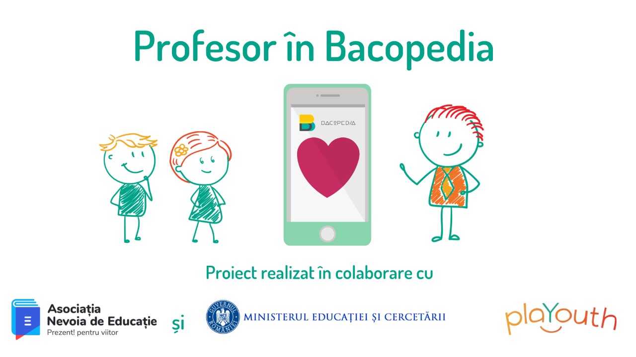 Asociația Nevoia de Educație și Asociația PlaYouth au lansat la începutul acestei săptămâni, cu ocazia Zilei Internaționale a Educației, Proiectul „Profesor în Bacopedia” – un proiect prin care se urmărește creșterea performanțelor educaționale pentru elevii de liceu și profesori, într-un mod non-formal, cu ajutorul unei aplicații digitale – Bacopedia.