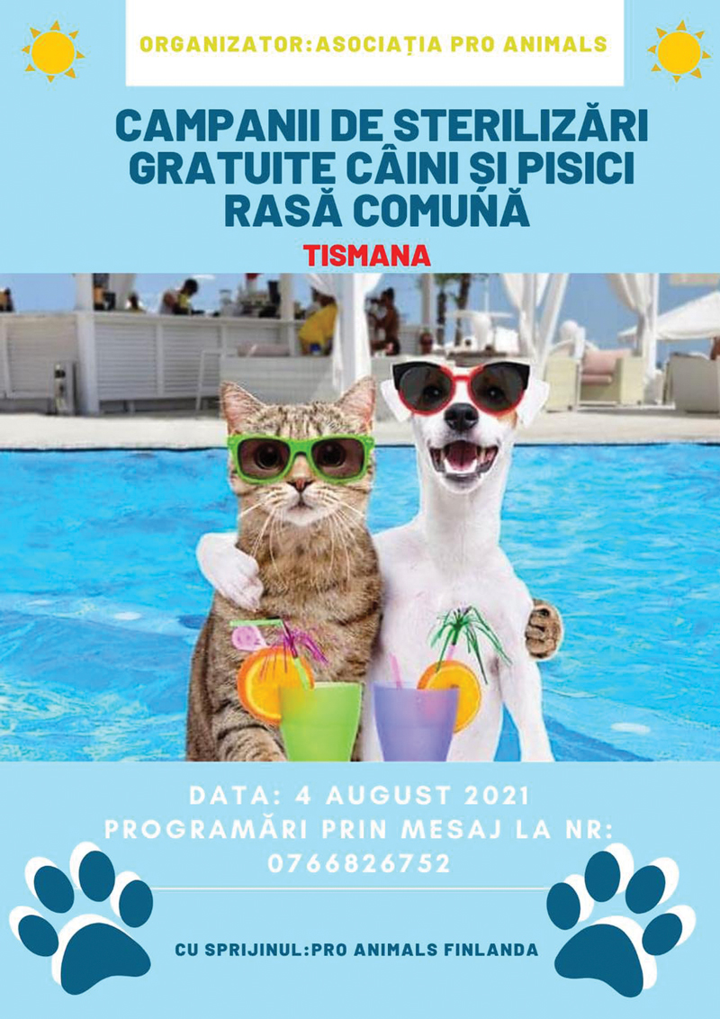 Şi în această lună, Asociaţia Pro Animals demarează o nouă campanie gratuită de sterilizări a câinilor şi pisicilor pentru proprietarii de animale, de această dată ca și localitate țintă fiind aleasă Tismana. Sterilizările vor avea loc mâine, 4 august. „Locul câinilor și al pisicilor nu este nici pe străzi și nici în adăposturi, iar, din păcate, acestea sunt suprapopulate datorită înmulțirii necontrolate și abandonului (care se sancționează, conform legii…