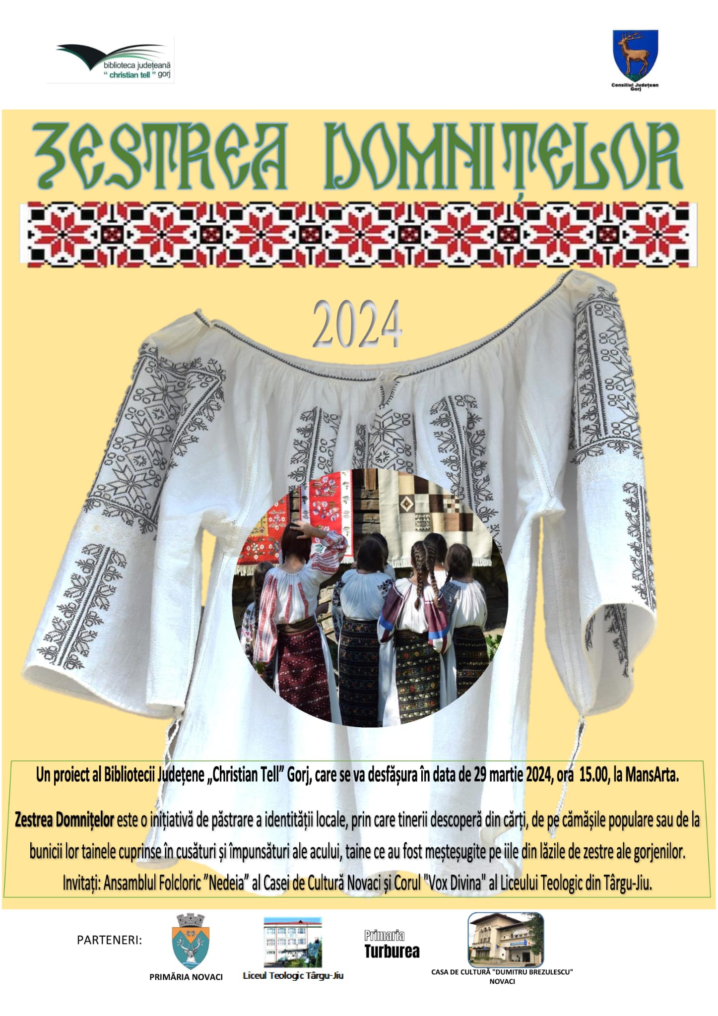 „Zestrea Domnițelor” este o inițiativă de păstrare a identității locale, prin care tinerii descoperă din cărți, de pe cămășile populare sau de la bunici, tainele cuprinse în cusături, taine meșteșugite pe iile din lăzile de zestre ale gorjenilor. Tema anului 2024 este „Tradiția, costumele populare…
