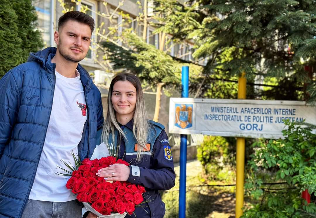 O tânără viitoare polițistă a cerută de soție joi, în fața sediului Inspectoratului de Poliție al Județului(IPJ) Gorj.