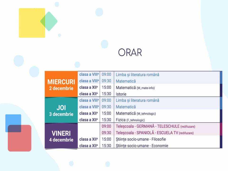 A fost anunțat orarul emisiunii “Teleșcoala” pentru perioada 2-4 decembrie. Astfel, miercuri și joi, elevii de clasa a VIII-a vor putea urmări, ca de obicei, lecții de Limba și literatura română și Matematică, începând cu ora 09:00, în timp ce elevii de clasa a XII-a vor putea urmări, începând cu ora 15:00, lecții de Matematică și Istorie (miercuri), respectiv Matematică și Fizică (joi). Orarul zilei de 4 decembrie este următorul: 9:00 – Teleșcoală – LIMBA GERMANĂ –…