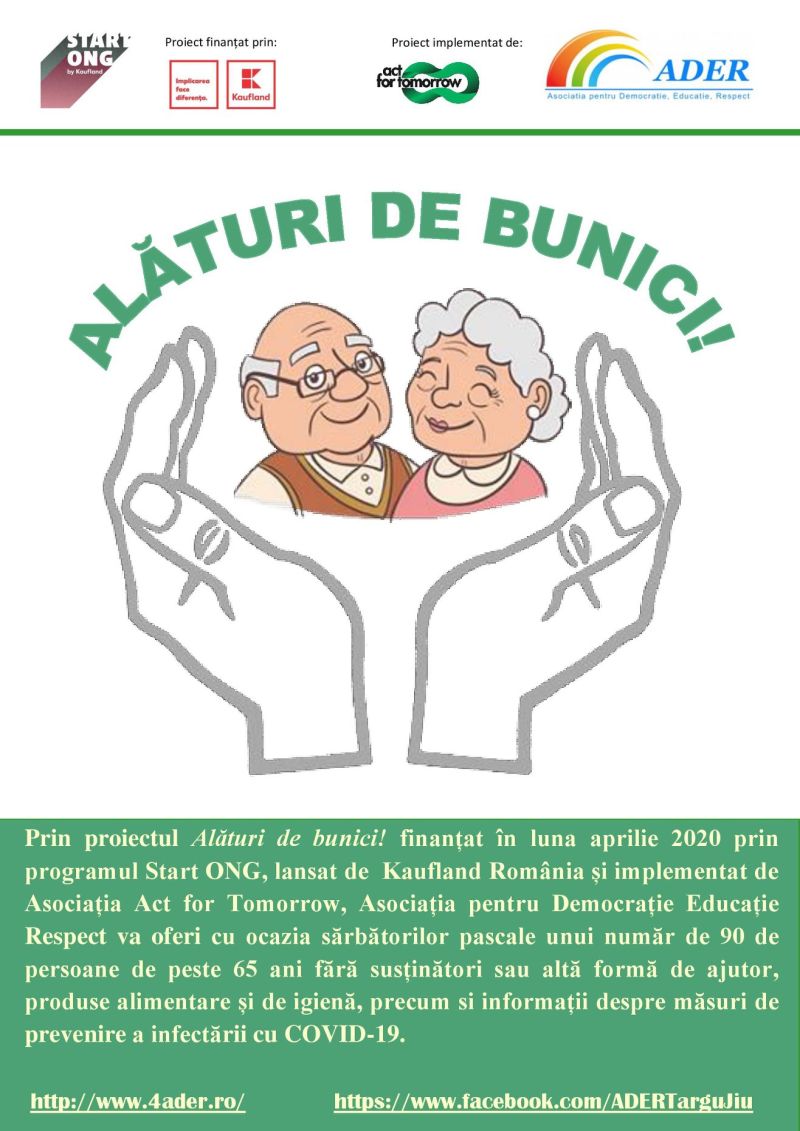 Asociația pentru Democrație, Educație și Respect implementează în perioada 14 aprilie – 14 mai 2020 proiectul ,,Alături de bunici”.Finanțat prin programul Start ONG, prin acest proiect vor fi oferite, cu ocazia Sărbătorilor Pascale, unui număr de 90 de persoane de peste 65 ani fără susținători sau altă formă de ajutor, produse alimentare și de igienă, precum și informații despre măsurile de prevenire împotriva infectării cu COVID-19.Start ONG este un program lansat…