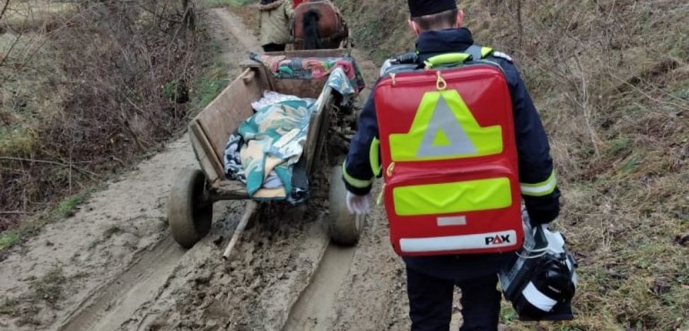Ambulanţa SMURD nu a putut ajunge, ieri, la o femeie care trăieşte într-un cătun al comunei Văgiuleşti, din judeţul Gorj, din cauza drumului plin de nămol, astfel că pacienta a fost transportată cu o căruţă.