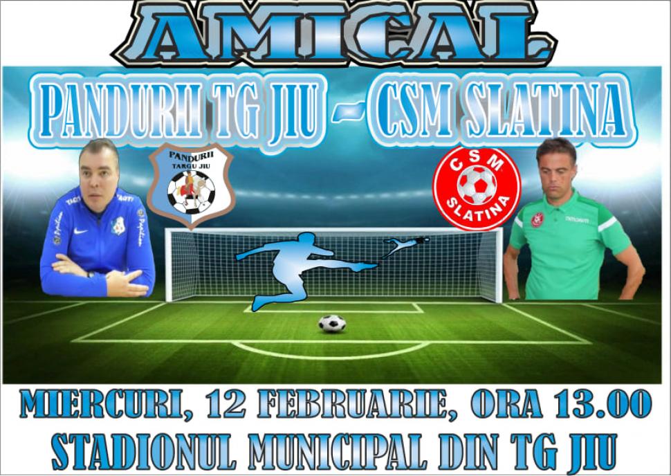 Pandurii Târgu Jiu are programat miercuri un ultim meci amical din perioada cantonamentului de pregătire centralizată. Gorjenii vor juca de la ora 13:00 cu formaţia de Liga 3 CSM Slatina, iar după cum au anunţat oaspeţii pe site-ul oficial, meciul s-ar juca pe Stadionul Municipal din Târgu Jiu.