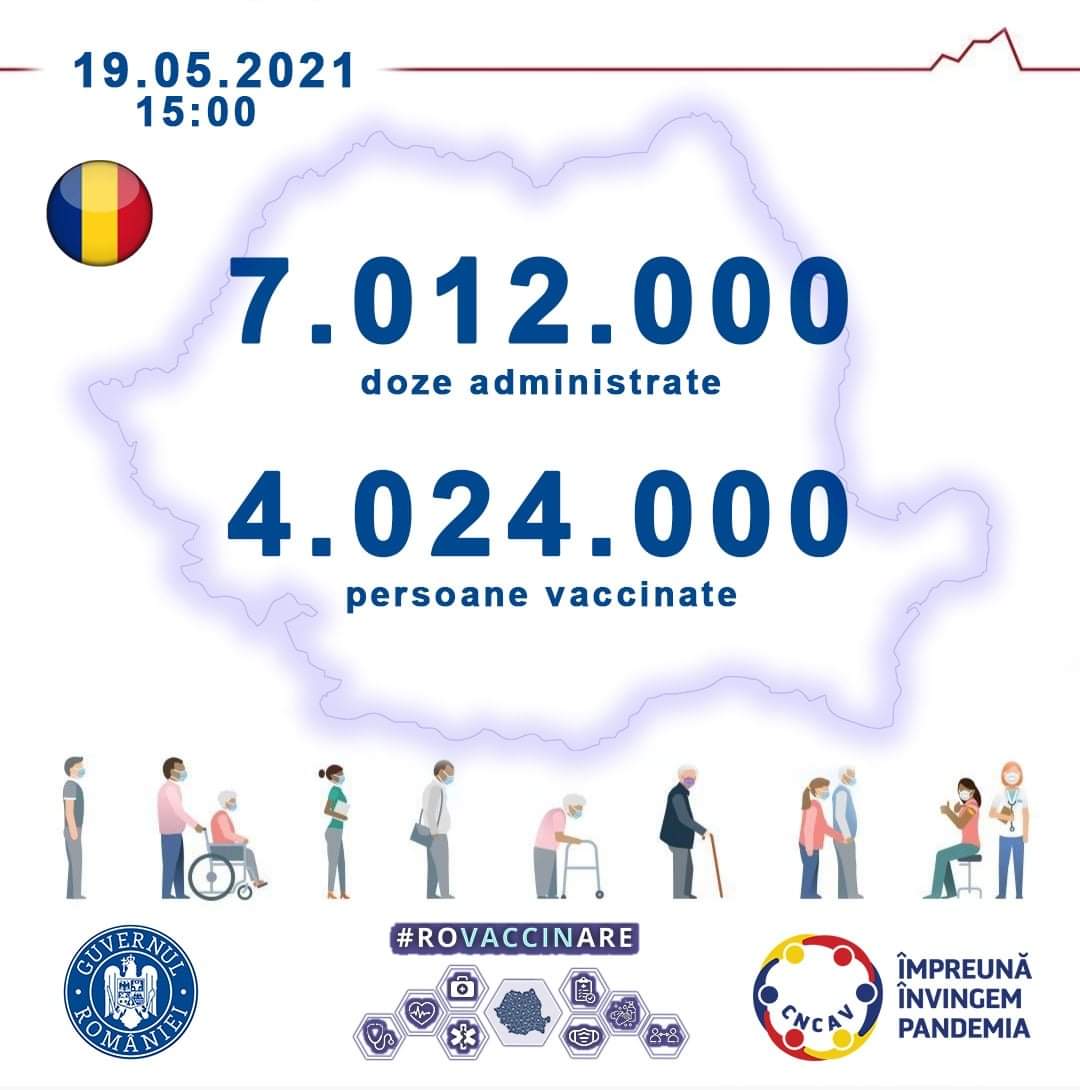 Astăzi a fost depășit pragul de 7.000.000 de doze administrate în cadrul campaniei naționale de vaccinare împotriva COVID-19. Până la ora 15.00, în România au fost vaccinate peste 4.024.000 de persoane împotriva COVID-19.
