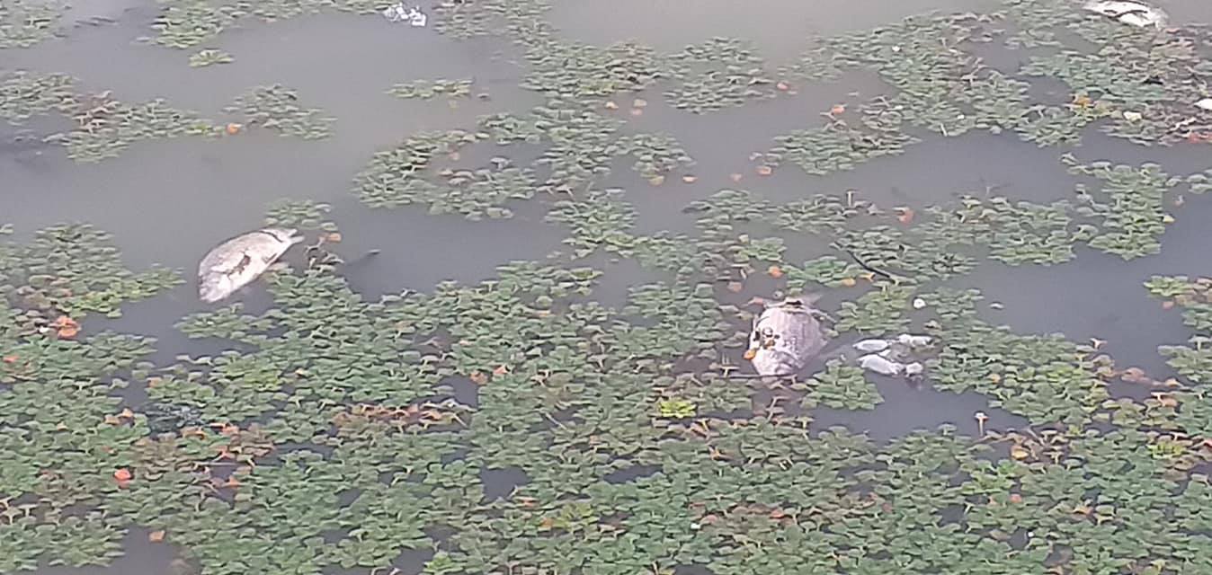 Zeci de pești plutesc pe lacul de acumulare de pe râul Jiu din zona Parcului Central din municipiul Târgu Jiu. Mai multe fotografii au fost postate pe Facebook.