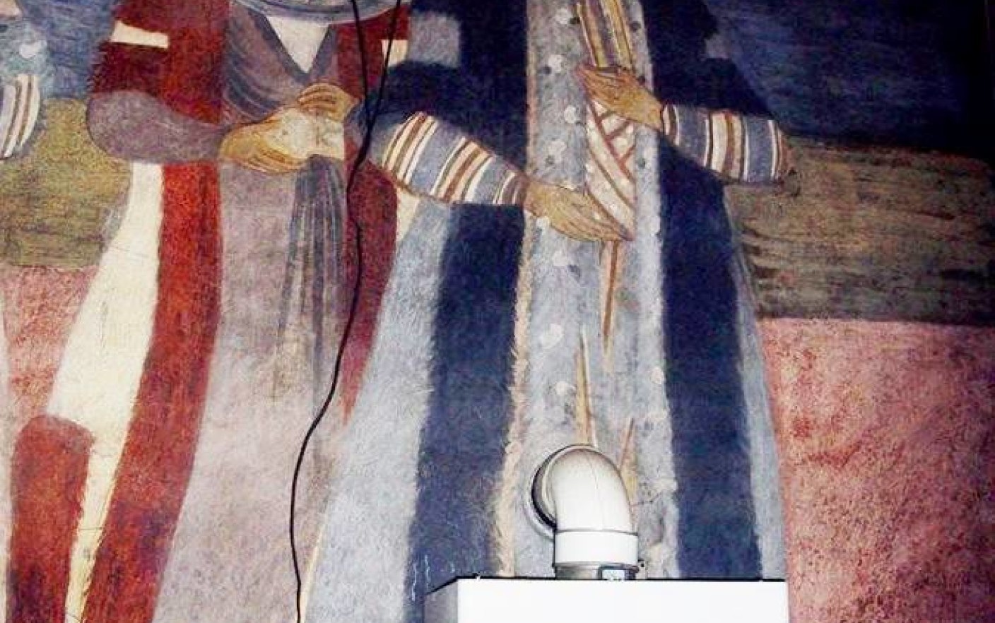 Imagini scandaloase într-o biserică din Târgu-Jiu. O pictură murală veche de mai bine de 200 de ani a fost perforată de o o centrală termică, scrie pandurul.ro.
