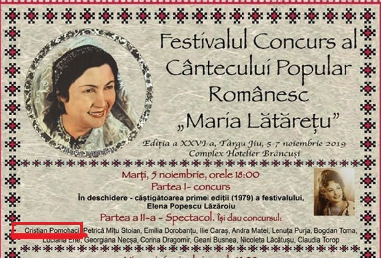 Cristian Pomohaci nu va mai cânta în cadrul Festivalului concurs „Maria Lătărețu“, cu toate că acesta apăruse pe afișul manifestării. Gheorghe Porumbel, directorul Ansamblului Folcloric Profesionist „Doina Gorjului“, a anunțat noul program al festivalului din care nu mai face parte Cristian Pomohaci, care a fost acuzat de pedofilie, însă a scăpat nepedepsit pentu că faptele s-au prescris: „În calitate de organizator principal, ne cerem scuze pentru situația creată….
