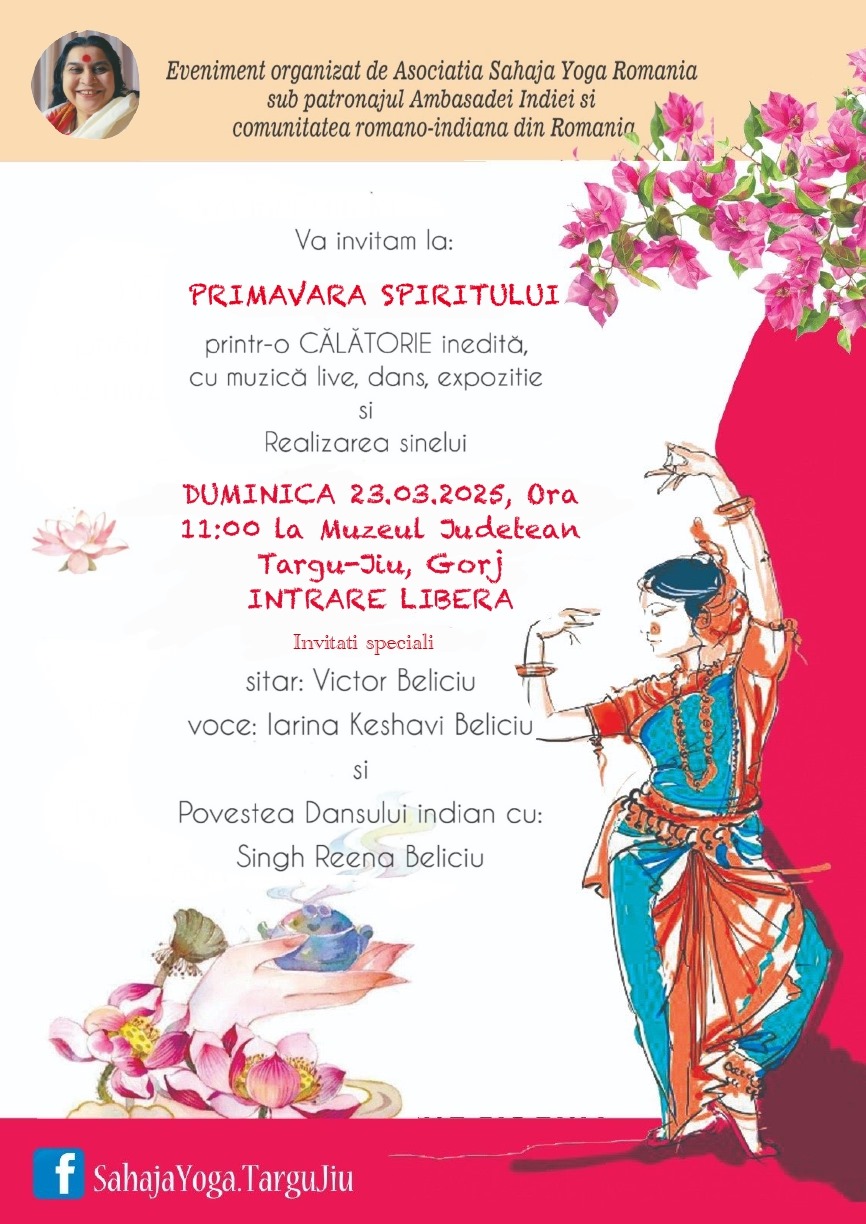 Publicul este invitat duminică 23 martie la ora 11:00 la Muzeul Județean din Târgu Jiu la un eveniment unic – un concert de muzică clasică indiană și dans, însoțit de meditație. Intrarea este gratuită, în limita locurilor disponibile. Evenimentul este organizat de Asociația Sahaja Yoga, sub patronajul Ambasadei Indiei și a comunității româno-indiene din România.