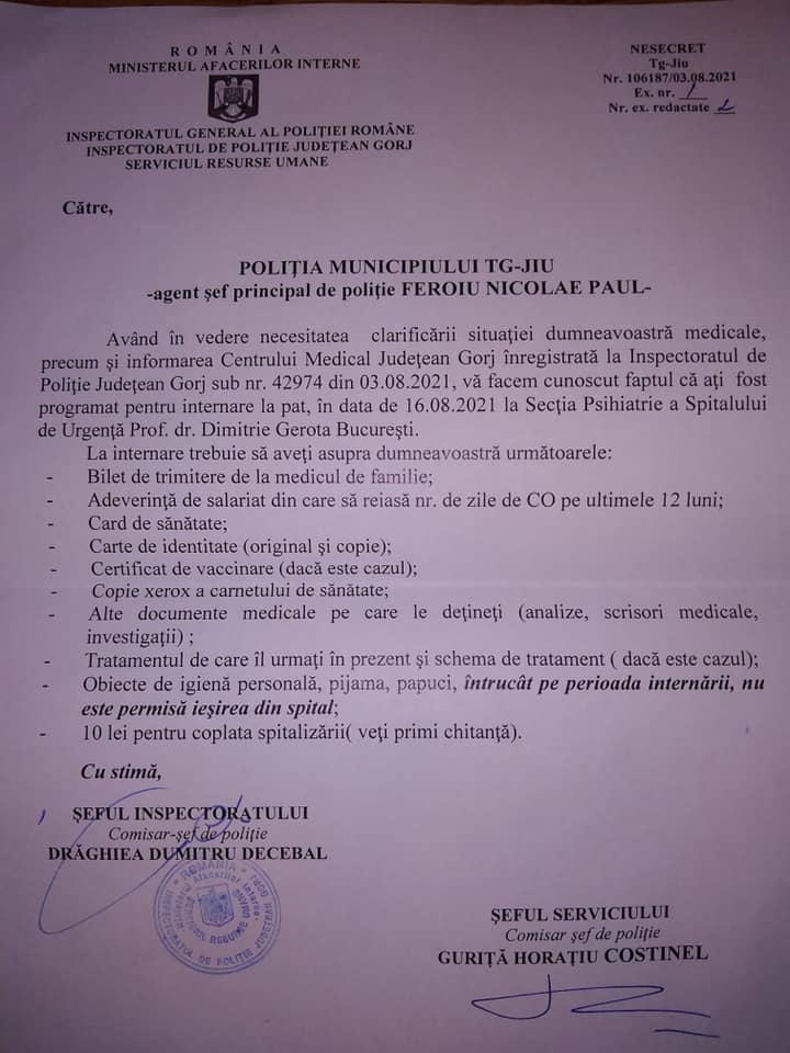 Motivul? Unul dintre polițiștii care a vorbit despre „nemerniciile sistemului” a fost programat să fie internat cu forța, „la pat”, la psihiatrie. Este vorba despre agentul Paul Feroiu, fost luptător SAS.
