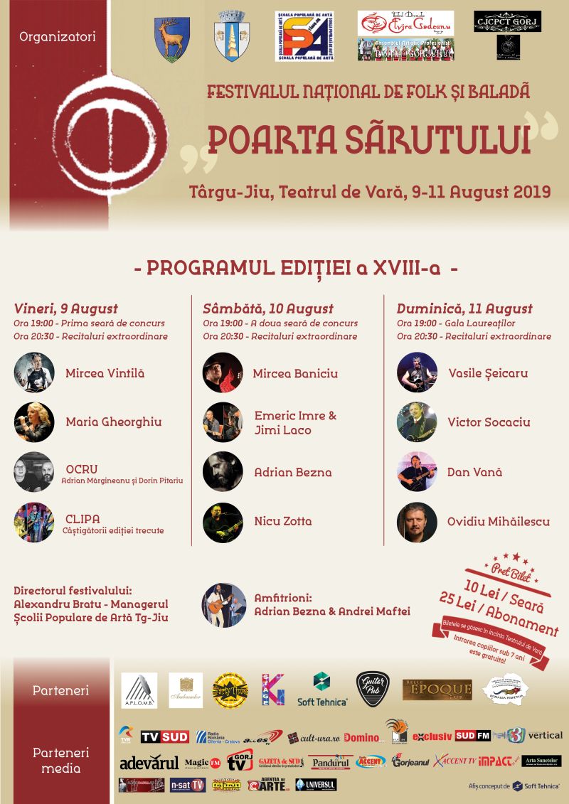 În perioada 9-11 august, în municipiul Târgu-Jiu, se va desfășura cea de-a XVIII-a ediție a Festivalului Național de Folk și Baladă „Poarta Sărutului”. Gorjenii vor avea parte de un adevărat maraton al poeziei cântate.