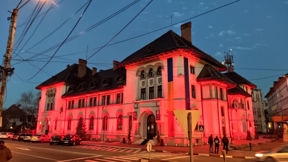 Clădirea Primăriei Târgu Jiu a fost iluminată, vineri seara, în culoarea roșie, cu ocazia Zilei Europene a Numărului de Urgență 112.