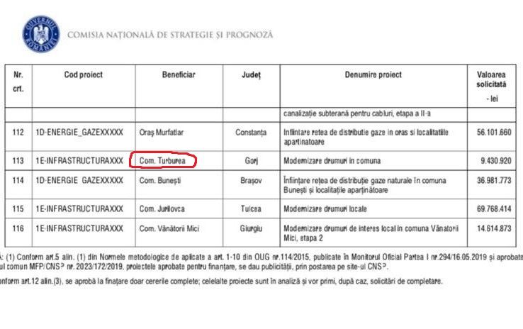 comunei Turburea spune că, din cele 116 proiecte aprobate la nivel național, pe