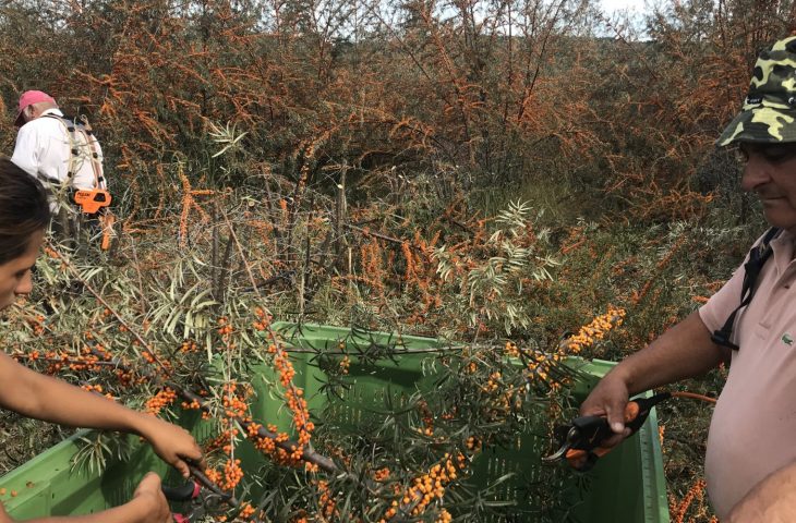 Producție excepțională de cătină, pe plantația de la Târgu-Cărbunești, cea mai mare din țară. Muncitorii taie crengile încărcate ale arbuștilor cu drujba.