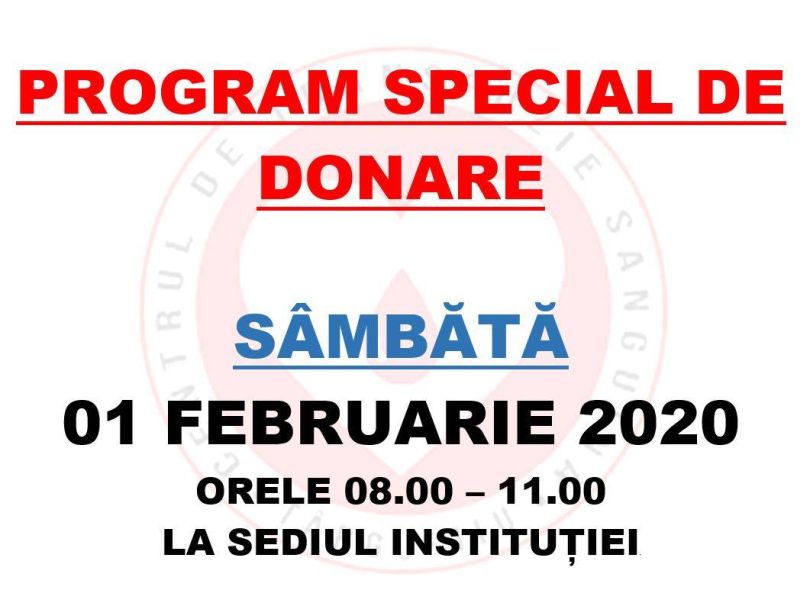 Centrul de Transfuzie Sanguină din municipiul Târgu-Jiu îi așteaptă sâmbătă, 1 februarie 2020, între orele 08.00-11.00, pe toți cei care doresc să doneze sânge, mai ales pe cei pe care programul de lucru din timpul săptămânii nu le-a permis să doneze. „Donează sânge, fii generos! Sângele este o resursă naţională; donarea de sânge este un act voluntar, anonim şi neremunerat. Sâmbătă, 1 februarie 2020, îi așteptăm pe toți cei care doresc să doneze sânge, la…