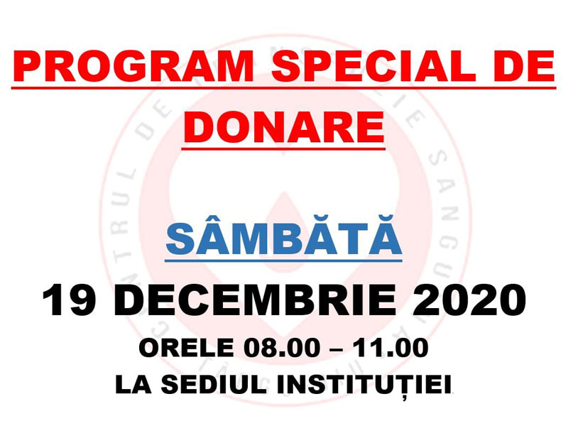 Sâmbătă, Centrul de Transfuzie Sanguină organizează un nou program special de donare de sânge! Astfel, Centrul de Transfuzie Sanguină din municipiul Târgu-Jiu îi așteaptă pe 19 decembrie 2020, între orele 08.00-11.00, pe toți cei care doresc să doneze sânge, însă programul de lucru din timpul săptămânii nu le-a permis să doneze. „Cu ocazia sărbătorilor de iarnă, vă așteptăm pe toți cei care doriți să faceți un cadou de suflet și de viață, ambalat într-o…