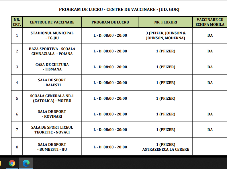 Sunt 11 centre de vaccinare în județul Gorj. Mai jos, programul lor de funcționare: