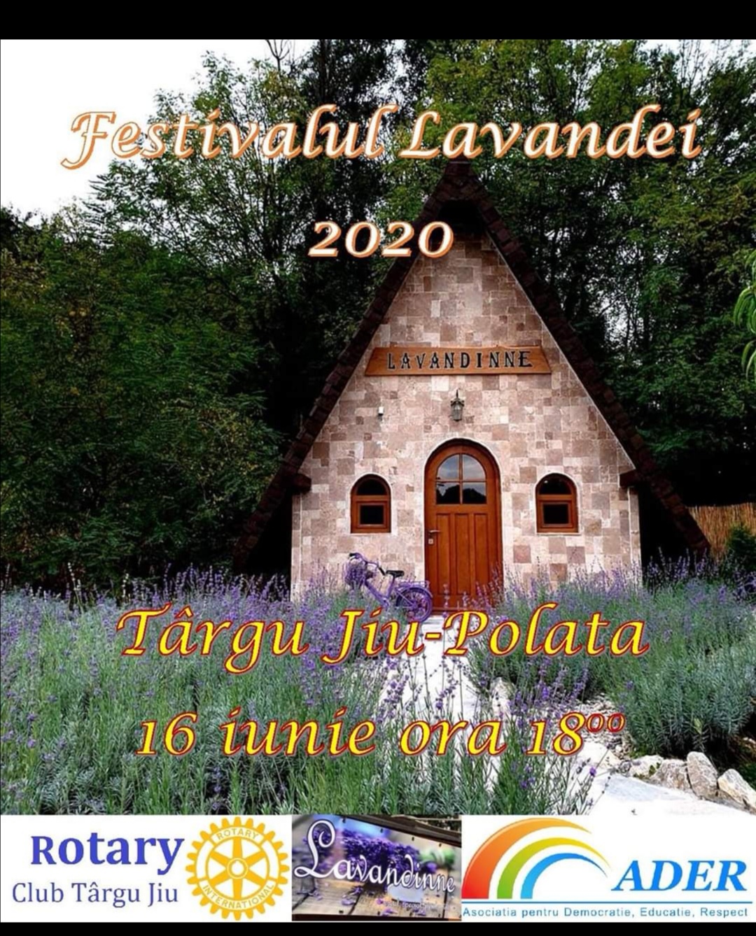 Clubul Rotary din Targu Jiu, în parteneriat cu Asociația pentru Democratie Educație Respect si Lavandinne o,rganizeaza mâine, 16 iunie 2020, ora 18:00, prima editie a Festivalului Lavandei. “Ne propunem sa incepem o serie de actiuni pentru sprijinirea antreprenorilor locali si profitând de frumusetea lavandei inflorite organizăm un eveniment deosebit, îmbinând muzica clasica cu frumusetea locului. Ai simțit vreodată mirosul câmpurilor de lavandă?