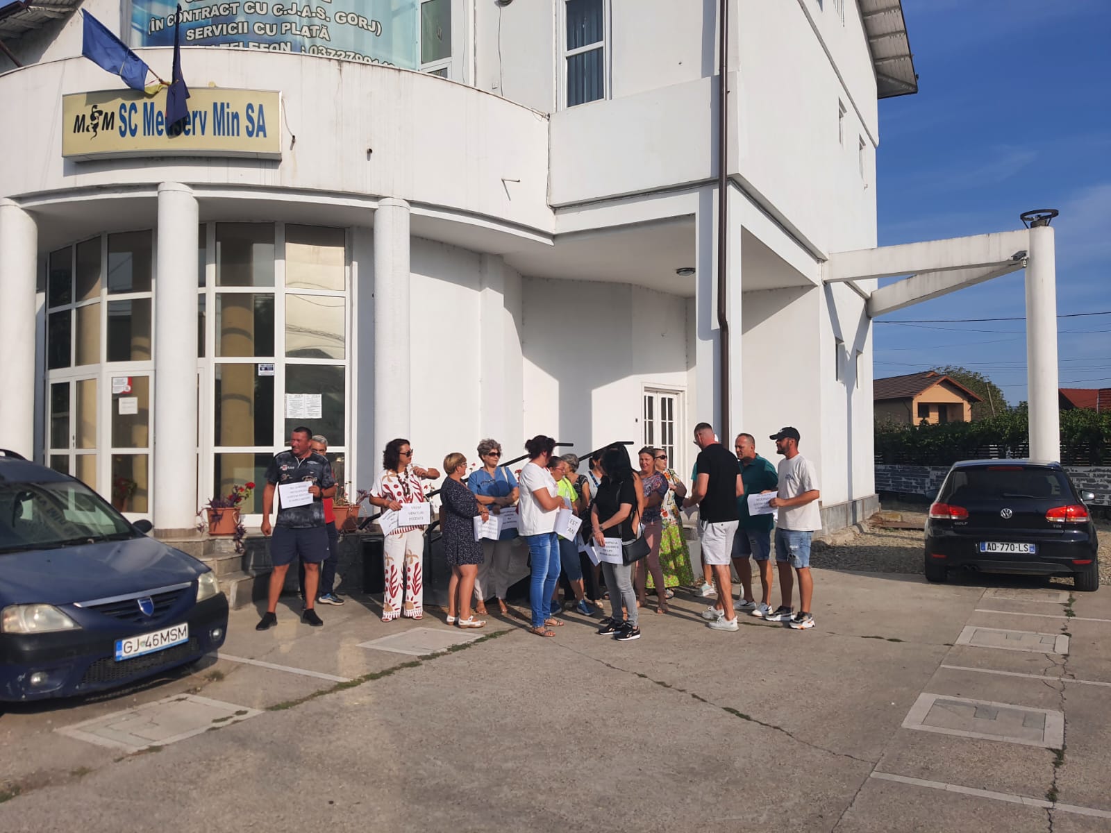 Zeci de persoane protestează marți dimineață în fața Medserv Min Târgu Jiu, prestatorul de servicii al Complexului Energetic Oltenia.