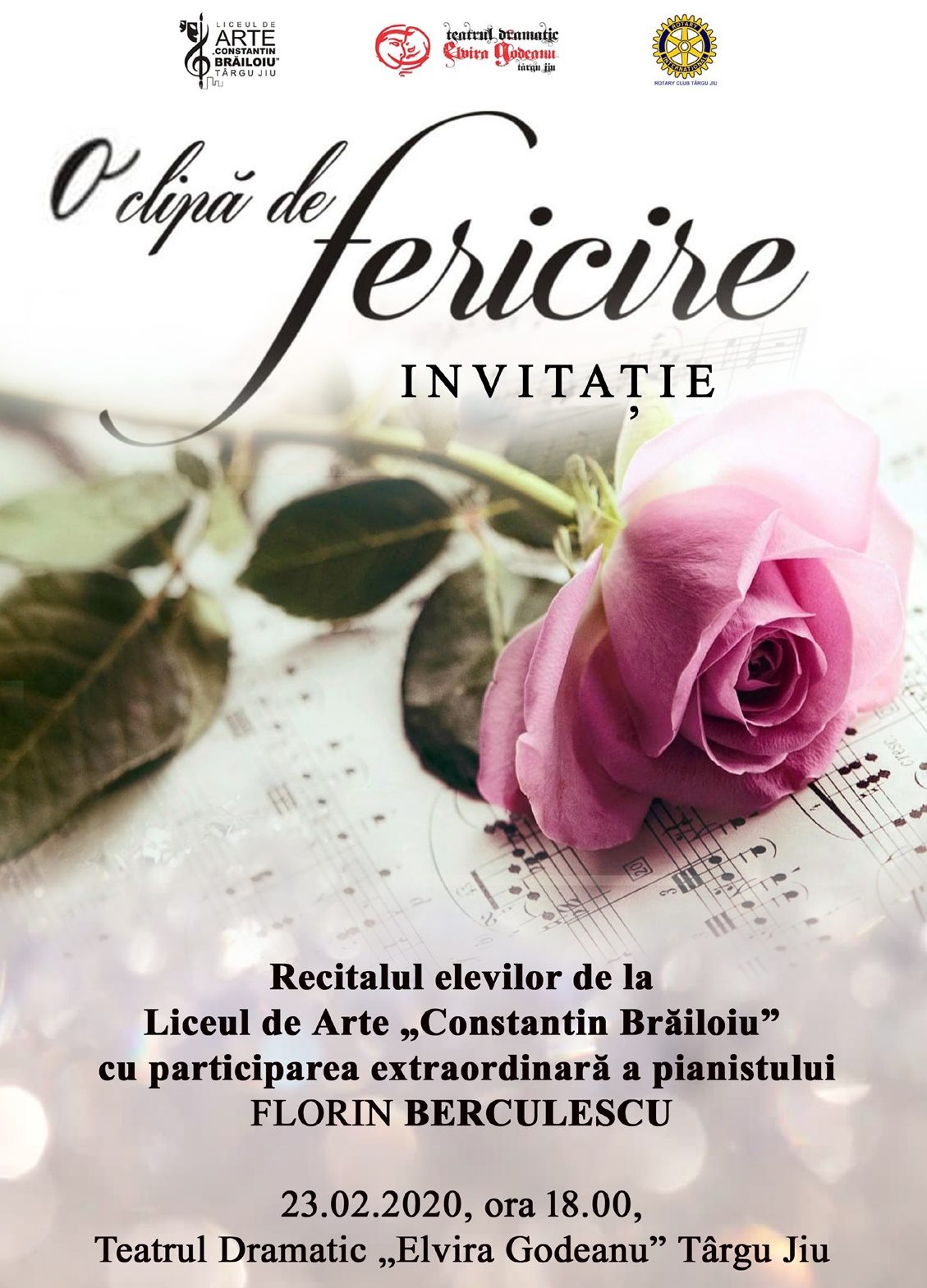 Cu prilejul aniversării a 115 ani de la fondarea Rotary International, Teatrul Dramatic “Elvira Godeanu” din Târgu Jiu va fi gazda recitalului elevilor de la Liceul de Arte “Constantin Brăiloiu” cu participarea extraordinară a pianistului Florin Berculescu. Evenimentul va avea loc pe 23 februarie, de la ora 18:00.