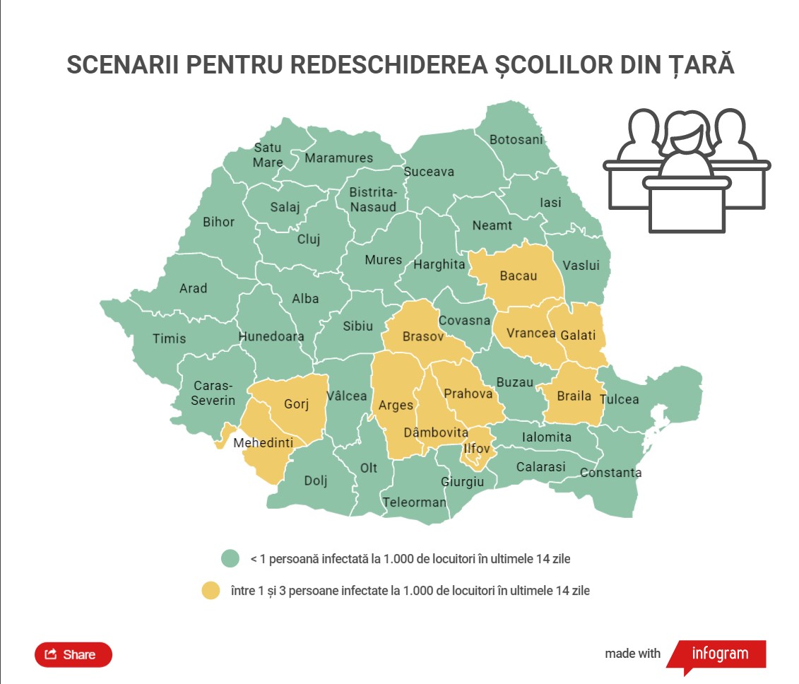 La doar cinci săptămâni până la începerea anului școlar autoritățile au realizat o hartă în funcție de numărul total de cazuri noi de COVID-19 înregistrat în ultimele 14 zile raportat la 1.000 de locuitori din localitatea în care se află şcoala. Gorjul și alte nouă județe sunt în zona galbenă, potrivit unui document oficial.