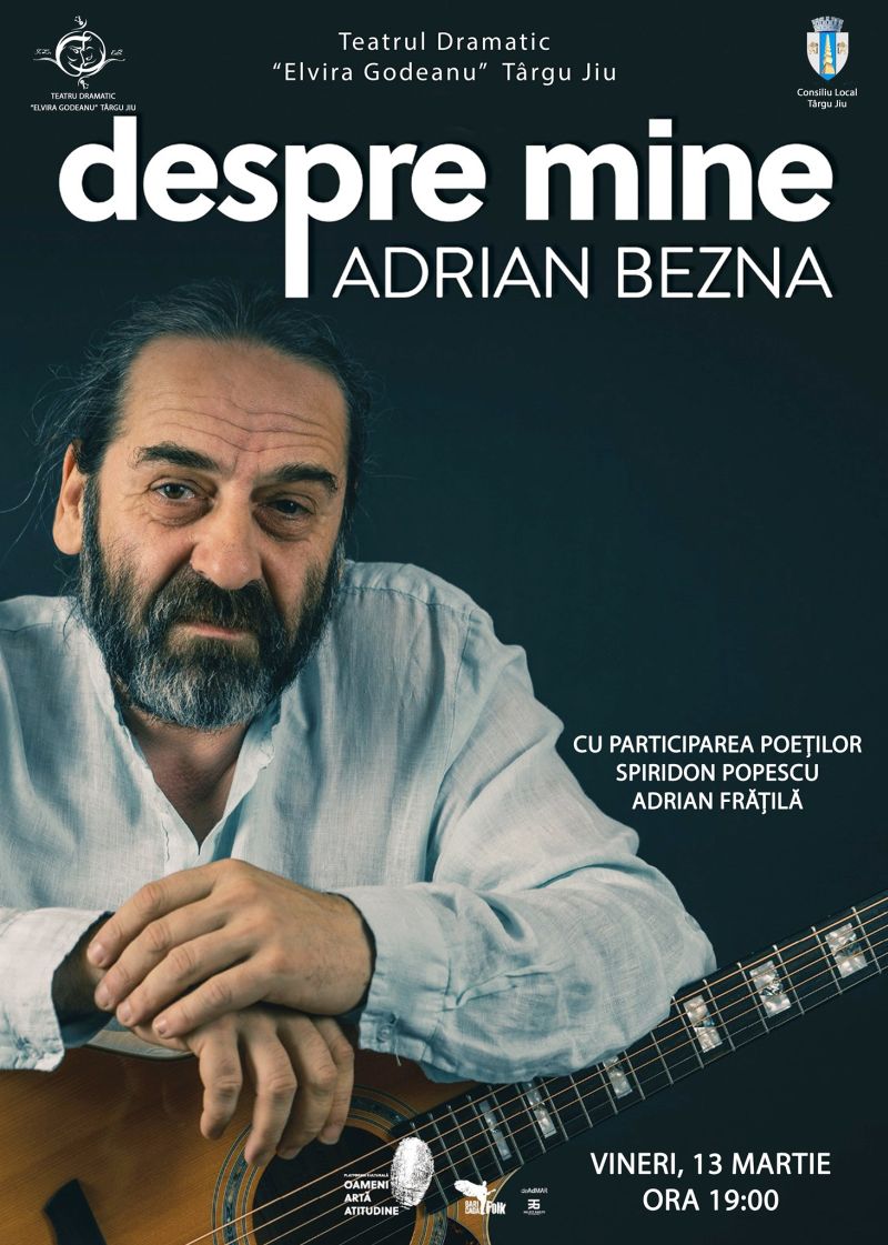 Târgujienii amatori se vor putea bucura de un nou regal de muzică folk şi poezie! Un spectacol în acest sens va avea loc vineri, 13 martie, de la ora 19.00, la Teatrul Dramatic „Elvira Godeanu” din Târgu-Jiu, fiind intitulat „Despre mine” şi aparţinându-i folkistului Adrian Beznă.„O întâlnire de suflet, vineri, 13 martie, ora 19.00, la Teatrul Dramatic ,,Elvira Godeanu”. Muzica și versurile cantautorului Adrian Beznă vor fi susținute artistic de poeții târgujieni…