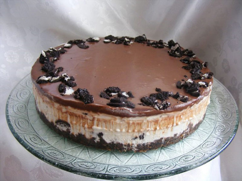 Cu ajutorul unui robot de bucătărie, se sfarmă biscuiții Oreo. Se adaugă untul topit și zahărul, se amestecă bine până la omogenizare. Cu ajutorul unei linguri, se tapetează o tavă cu blatul mai devreme obținut. Se pune la frigider…