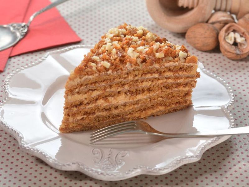 Se mixează smântâna lichidă adăugând treptat mascarpone şi sos caramel. Se pune gelatina la dizolvat în trei linguri de apă. Se lasă cât să se umfle, apoi se încălzeşte uşor, dar nu se fierbe amestecul. Se toarnă gelatina uşor călduţă în cremă, mixând până când se formează o cremă omogenă. Se secţionează blatul copt şi răcit pentru a obţine trei foi de blat. Se lasă 4-5 linguri de cremă deoparte, pentru a pune pe părţile laterale ale tortului, iar crema rămasă se împarte în două. Se distribuie uniform jumătate din cremă peste una dintre foile de blat şi se acoperă cu a doua foaie. Se întinde crema rămasă şi se aşează a treia foaie de blat. Deasupra se întinde uniform amestec de sos caramel şi nucă măcinată. Părţile laterale ale tortului se ung cu crema mascarpone pusă deoparte. Se decorează tortul cu miez de nucă. Înainte de a porţiona, tortul se lasă la frigider timp de câteva ore sau chiar peste noapte.