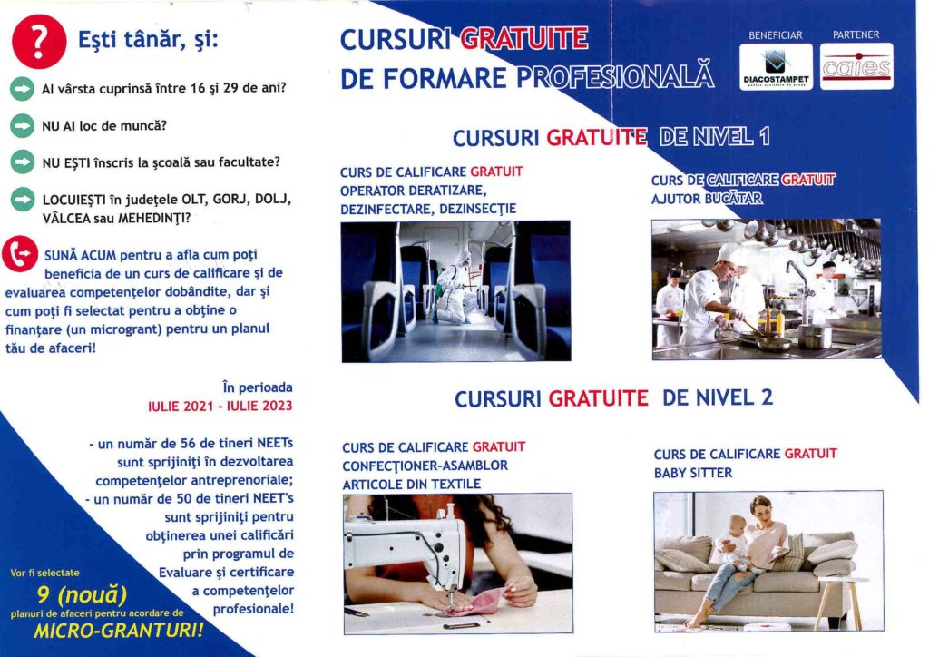 În cadrul unui proiect cofinanțat din Fondul Social European, prin Programul Operațional Capital Uman 2014 – 2020, Primăria orașului Rovinari, în parteneriat cu Diacostampet S.R.L, vine în ajutorul tinerilor cu vârste cuprinse între 16 și 29 de ani, fără un loc de muncă și care nu urmeză nicio formă de învățământ. Aceștia se pot califica GRATUIT în următoarele meserii: