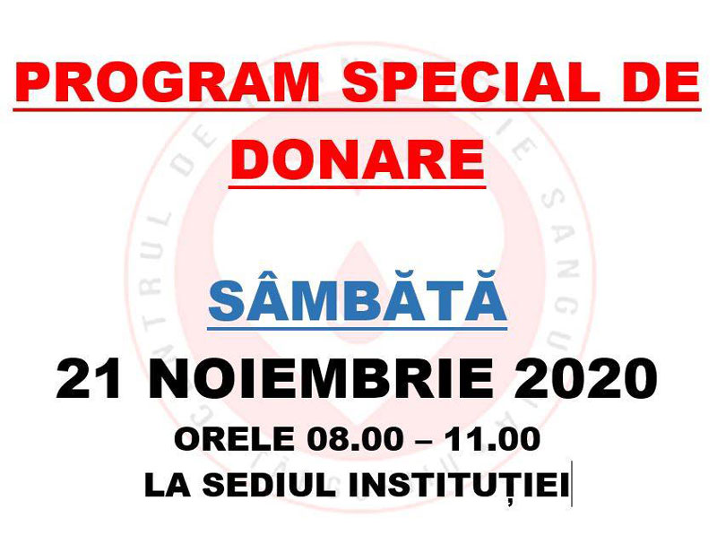 Sâmbătă, Centrul de Transfuzie Sanguină organizează un nou program special de donare de sânge! Astfel, Centrul de Transfuzie Sanguină din municipiul Târgu-Jiu îi așteaptă pe 21 noiembrie 2020, între orele 08.00-11.00, pe toți cei care doresc să doneze sânge, însă programul de lucru din timpul săptămânii nu le-a permis să doneze. „Donează sânge, fii generos! Sângele este o resursă naţională; donarea de sânge este un act voluntar, anonim şi neremunerat….