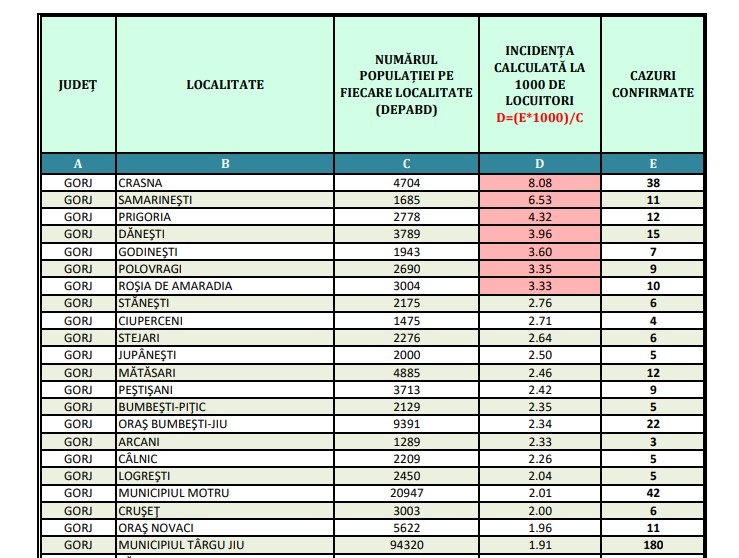 Rata de infectare în județul Gorj a ajuns la 1,74. șapte localități fiind în scenariul roșu. Este vorba de Crasna – 8,08, Samarinești – 6,53, Prigoria – 4,32, Dănești – 3,96, Godinești – 3,60, Polovragi – 3,35 și Roșia de Amaradia – 3,.33.