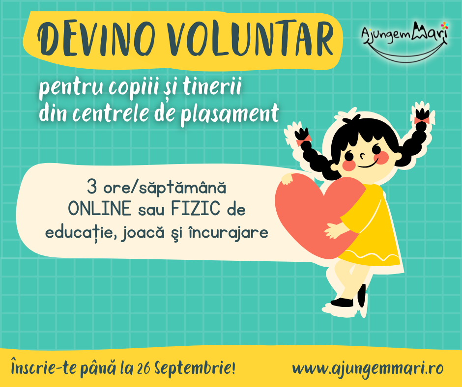 Programul educațional „Ajungem MARI” a demarat o nouă campanie de înscrieri pentru voluntari care să fie alături de copiii din centrele de plasament, apartamentele și căsuțele de tip familial. Doritorii, care vor face activități online și fizic alături de tineri timp de opt luni, se pot înscrie până pe data de 26 septembrie.